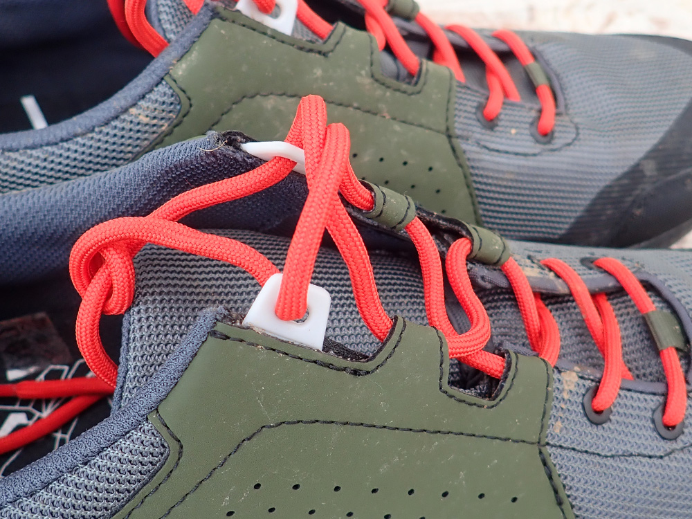 Op de trails geeft de schoen een goede grip. Rijdt je met volwaardige platformpedalen dan kun je de insert gewoon laten zitten maar wij biken met de Magped pedalen en het ijzeren schoenplaatje zit ook netjes verzonken in het midden van de schoen. Tijdens het rijden van technische trails hebben we geen enkele keer het gevoel gehad van de pedalen te schieten en de schoen blijft netjes aan de voeten. Wel met een dubbele strik in de veters. De veters zijn niet te lang en kunnen mooi weggestopt worden onder een veterhouder welke aan de tong van de schoen zit.