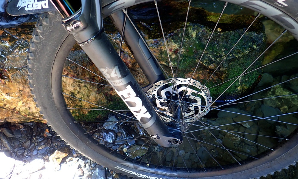 De Fox 34 Rythm zorgt er in ieder geval voor dat je lekker over de stenen en wortels kunt knallen. Qua afstellen zit er niet veel poespas op. Preload, rebound en compressieknop. De vork doet zijn werk zonder morren en de 34 mm poten zorgen in combinatie met het Raceface AR30 wiel voor een stijve voorkant. De bike reageert dan ook goed op de stuurbewegingen. De 67,5 graden balhoofd speelt daar natuurlijk ook in mee. De gulden middenweg tussen XC en Enduro.