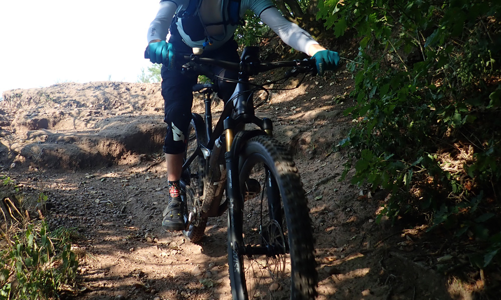 Tijdens het knallen over de stenen merk je beter dat je met een 130 mm trail bike onderweg bent. De demper gebruikt zijn maximale veerweg maar je hebt niet het gevoel dat je met meer veerweg onderweg bent. Niks mis mee, we hebben immers nog een paar cm over welke in onze gewrichten zitten.