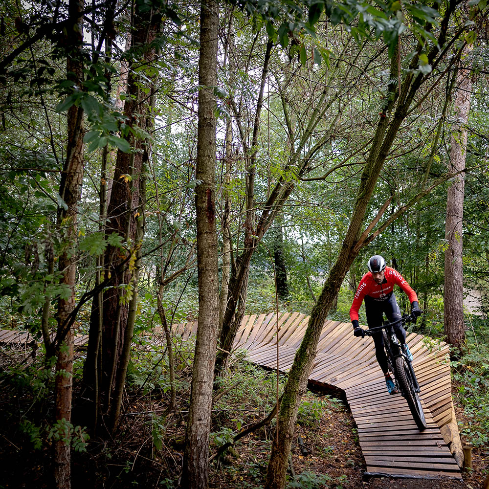 We duiken, letterlijk, de route in via een drop en rollen in de richting van de Monkey Trail. Een grote steensectie, nat en glad van de regen, ligt voor ons en dankzij de tips welke we van de routebouwers krijgen schieten we snel over de rotsen. Deze zijn vanuit, een steengroeve in de Ardennen naar Nederland gebracht en met een kraan op de plaats gelegd. Tussen de rotsen liggen een aantal houten segmenten welke alles aan elkaar verbinden. Een dikke drop op het einde zorgt dat we uitkomen op een houten sectie compleet met wallrides. De nieuwe lijn is flink technisch voor Nederlandse begrippen en zou niet misstaan in een Italiaans bikepark. Chapeau voor de bouwers.