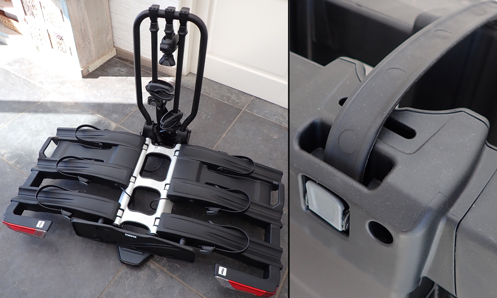 Het plaatsen van de drager doe je gewoon alleen. Met een gewicht van 23 kilo is het geen vedergewicht maar je tilt hem vrij makkelijk op de trekhaak. Nu zijn ze bij Thule zo slim geweest om de XT 3 (ook wel de 934 genoemd) te voorzien van wieltjes. Je hoeft hem dus niet vanuit de garage naar de auto te dragen maar rolt hem gewoon daarheen. De drager klapt niet makkelijk uit elkaar en wordt door middel van een ingebouwde rubber bij elkaar gehouden. Dit rubber zit vast gemonteerd in de drager, je hoeft dan ook niet bang te zijn dat je het verliest.