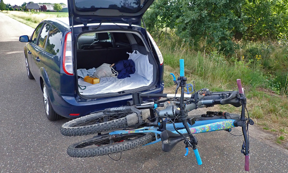 Nu is het niet zo dat je niet meer hoeft te puzzelen om de bikes te monteren want je moet natuurlijk wel rekening houden met de stand van de pedalen. Daar kwamen wij natuurlijk weer achter op het moment dat we een Efully en een Ehybride op de drager monteerden. 2 mountainbikes met dezelfde framesoort plaats je een stuk makkelijker zonder puzzelwerk. Qua tussenruimte hebben we het niet nodig gevonden om schuimrubber tussen de wielen en vorken van de 2 fietsen te steken. De bikes staan ver genoeg uit elkaar dat zelfs 2 fietsen met boost naven elkaar nog niet raken.